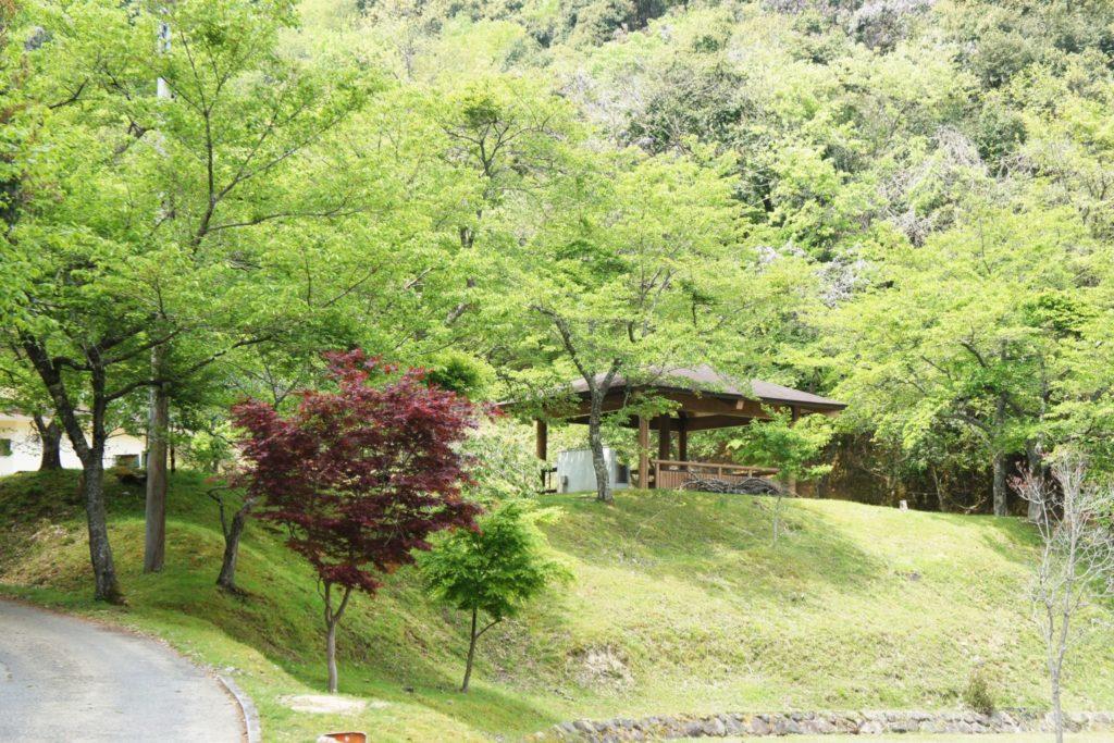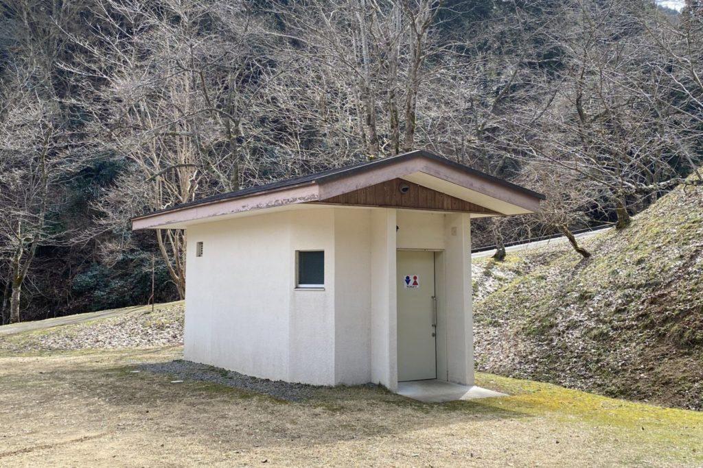 遠目から写真を撮っただけですが、中段あたりにトイレと炊事棟があります。